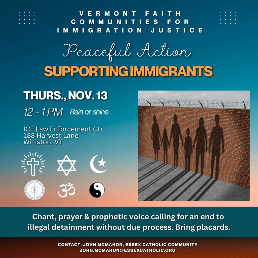 The Vermont Catholic Worker joins with Vermont Faith Communities for Immigration Justice, and other Catholic organizations across the country, to launch the One Church, One Family: Catholic Public Witness for Immigrants campaign, a nationwide movement calling people of faith to publicly demonstrate solidarity with migrant families, asylum seekers, and refugees.