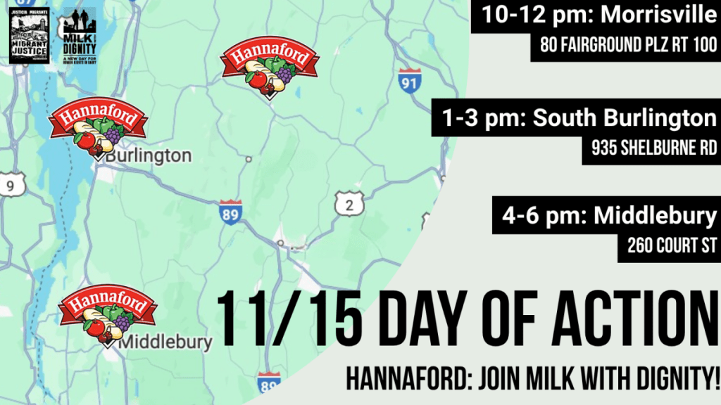 Stand with farmworkers on Saturday, 11/15. Join the Milk with Dignity pickets of Hannaford Supermarket in Morrisville (10am-12pm), South Burlington (1-3pm), or Middlebury (4-6pm) – or come along for all three!